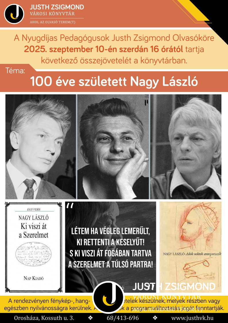 Ezúttal az olvasókörünk megelőzte a taggyűlésünket, és a tavasszal megbeszéltek szerint Nagy László élete és költészete volt a téma születésének 100. évfordulója alkalmából. Csányiné Kádár Tünde idézte fel a költő gyermek- és ifjúkorát, életének fontosabb állomásait. Nagyszerű videó részleteket válogatott össze szemléltetésül, amelyek szemléletesen egészítették ki ismertetőjét.