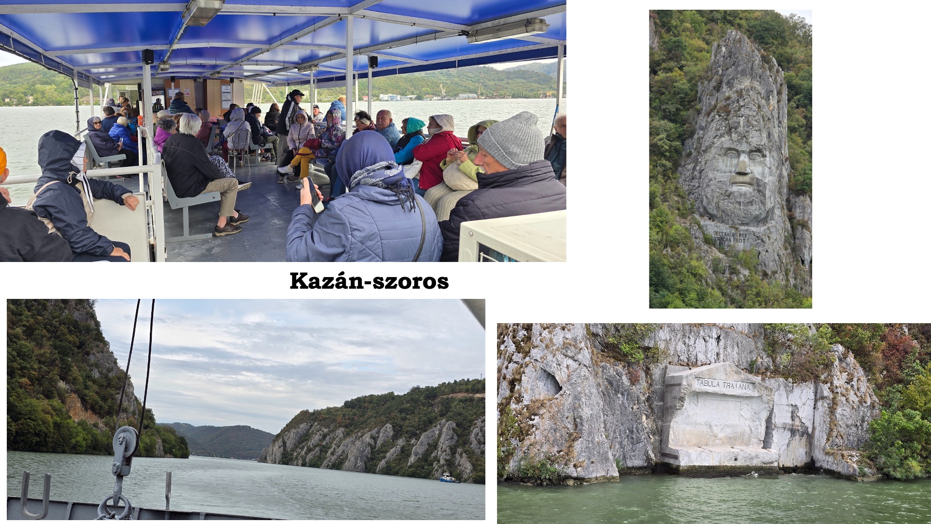 Következő úticélunk az "új" Orsova volt, ahol a dunai kikötőben már várt ránk a hajó. Kb. 2,5 órás utunkon a Duna által áttört víziút, a Kazán-szoros természeti szépségeit csodálhattuk meg, a fantasztikus sziklafalakat, erdős partszakaszokat, a Mrakónia Kolostort, Traianus római császár emléktábláját és az utolsó dák király, Decebál 55 méter magas szobrát. A 2. században épült Traianus hidat még a népvándorlás korában lebontották, de nem látható már a Széchenyi kezdeményezésére és támogatásával épült út és az emléktáblája sem. A Vaskapu vízierőmű megépítése nyomán felduzzasztott víz örökre elrejtette azt a kápolnát, amit a Szent Korona elrejtésének (1849) helyén emeltek, és a Jókai által megörökített Senki szigete (Ada Kaleh), de a régi Orsova is. Hideg, szeles idő volt, néha az eső is szemerkélt, mégis nagy élmény volt a két ország határát jelentő (román – szerb) folyószakaszon hajózni.