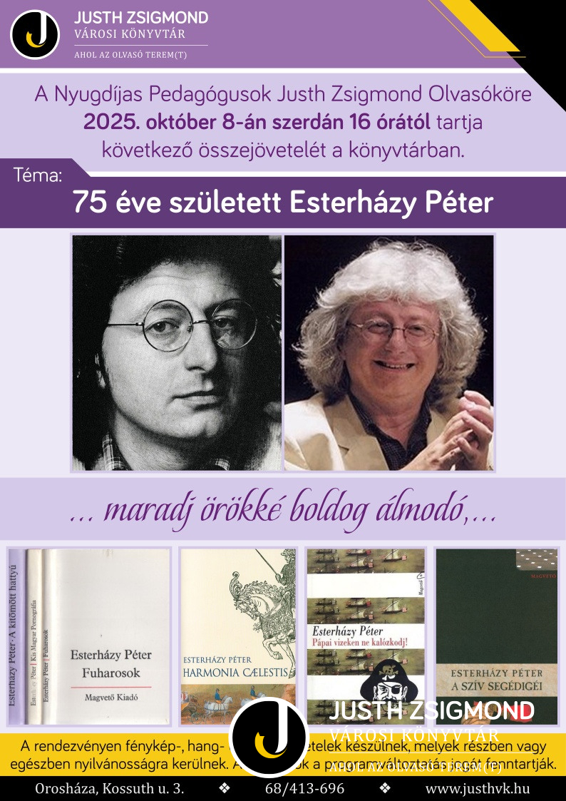 Olvasókörünkön a 75 éve született Esterházy Péterre emlékeztünk. Viszonylag kevesen olvassák és kedvelik az írót, mert regényei, novellái nehéz olvasmányok, ugyanakkor rengeteg emberi értékre, erkölcsi problémára hívják fel a figyelmet.