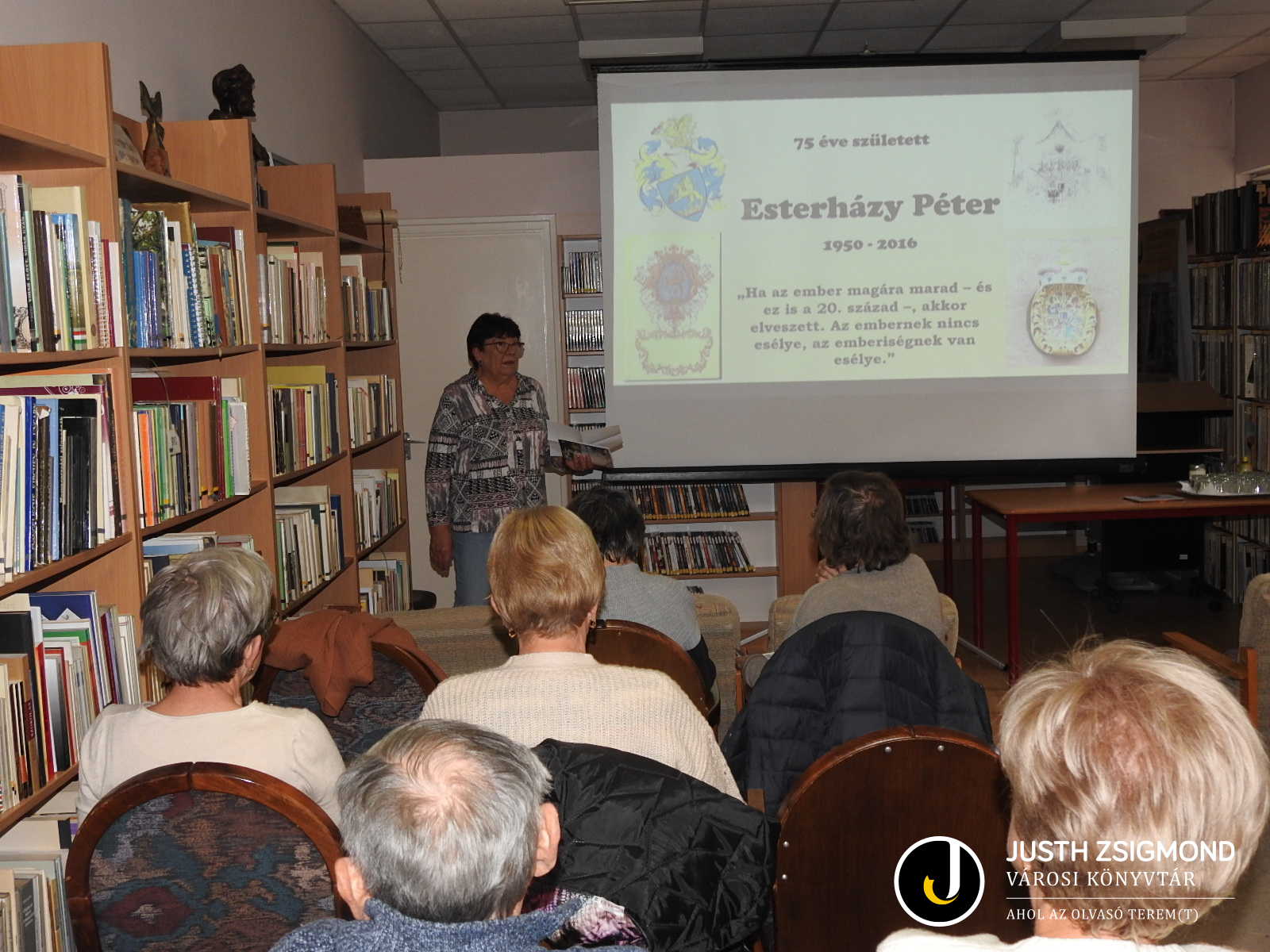 Sajátos stílusát és legjelentősebb műveit Makuláné Gulicska Valéria mutatta be. Néhány érdekes videó részlet lejátszásával tette érthetőbbé Esterházy művészetét és mutatta meg kedves egyéniségét.