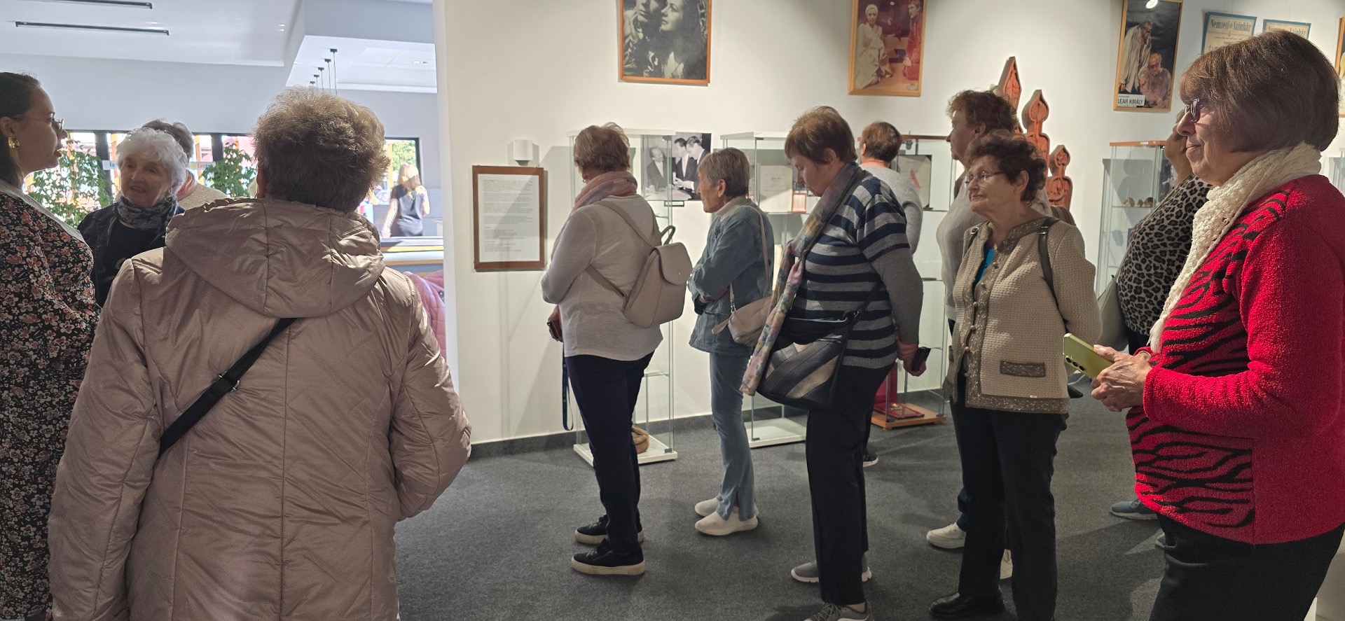 Igaz, csak kilencen indultunk el a reggeli vonattal, de nem bántuk meg. Ezúttal Békéscsaba felé mentünk, és a foglalt időpontra sikerült odaérnünk. Döbbenten láttuk a hosszan kígyózó sort az utcán, és örültünk az internetes jegyvásárlás előnyeinek. Várakozás nélkül bemehettünk. Miután lepakoltunk a ruhatárban, indultunk a kiállítóterembe.