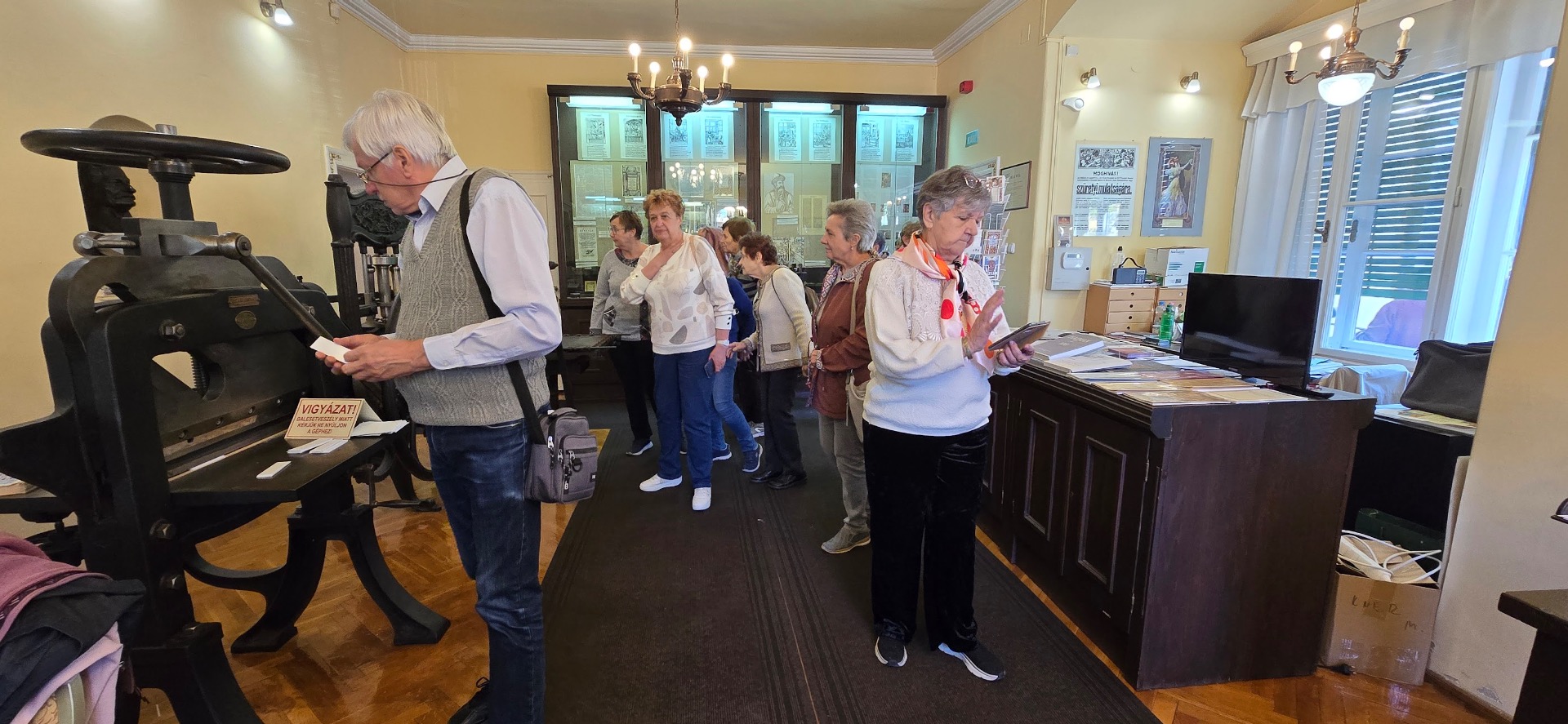 Ha csak ennyit láttunk volna, akkor is elégedetten térhettünk volna haza, de másfél óra múlva cseréltünk. Az utca túloldalán lévő nyomdaipari múzeumban gyűjtöttünk újabb élményeket. Vezetőnk 60 évet töltött el a Kner Nyomda szolgálatában, ebből 18 évet a múzeumban. "Karcsi bácsi" nyomdászként kiválóan ismeri a különböző korok eszközeit, munkafolyamatait. Útmutatása alapján két gépet mi is kipróbálhattunk. Rá kellett jönnünk, milyen nehéz munka volt a nyomdászat. Megismertük a Kner család felemelkedésének izgalmas történetét, életük tragédiáit, hazai és külföldi sikereik okait. Nyomdájukat végtelen precizitás, innovativitás jellemezte, dolgozóikat gondosan válogatták ki és megbecsülték. A sok szép kiadvány között felfedeztük az orosházi születésű költő, író, Jászai-Horváth Elemér egyik kötetét is. Kellemes meglepetés volt.