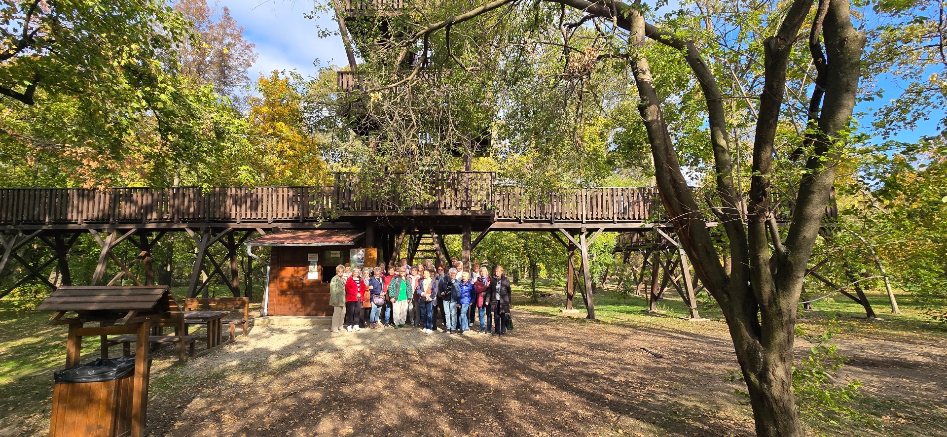 Következhetett egy kis pihenő a Hármas-Körös egyik holtága mellett Sisy tiszteletére telepített ligetben, ahol gyógyfürdő és kemping, lombkorona sétány és kilátó várja a turistákat. Az egyik fogadóban elfogyasztottuk az előre megrendelt ebédet, azután ragyogó napsütésben ismerkedtünk a térség élővilágával. Élveztük a szép kilátást a magasból. Élményeinket természetesen sok fotóval is megörökítettük. Kellemesen elfáradva, élményekkel feltöltődve indultunk haza.