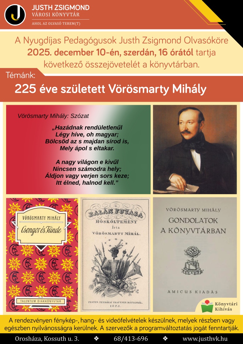 Ezévi utolsó olvasókörünkön Vörösmarty Mihályra emlékeztünk vezetőnk, Csányiné Kádár Tünde előadásával. Megismerhettük (felidézhettük, hiszen mindannyian tanultunk róla) életútját és legjelentősebb munkáit, amelyek a magyar történelem felemelő és ugyanakkor tragikus korszakához kötődtek.