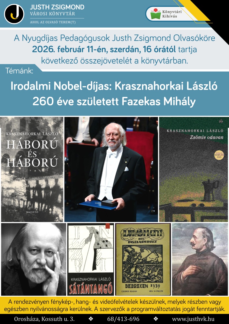Ezután Makuláné Gulicska Valéria a második magyar Nobel-díjas íróról, Krasznahorkai Lászlóról tartott előadást. Vali a tőle megszokott alapossággal készült. Sikerült röviden bemutatni az író változatos életútján keresztül annak óriási, szerteágazó műveltségét. Megemlítette fontosabb műveit, magyar és nemzetközi díjait, melyeket 2025-ben a Nobel-díj koronázott meg. Több művéből film is készült Tarr Béla rendezésében, legismertebb az 1994-ben bemutatott Sátántangó. Az előadást filmbejátszások, képek élénkítették. Érdekes, figyelemfelkeltő előadás volt.